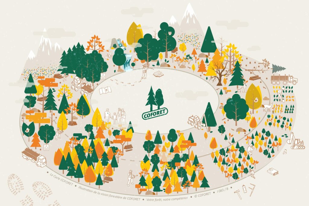 Pensé comme une illustration circulaire, le Cycle COFORET permet de découvrir, d’un simple clic, toutes les dimensions de notre coopérative : notre histoire, notre gouvernance, nos métiers, nos services, les enjeux forestiers actuels, les rôles de la forêt, les outils des forestiers, ou encore les pratiques que nous défendons.